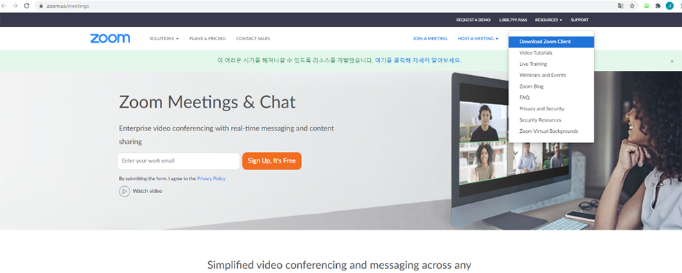 1. Truy cập ZOOM (https://www.zoom.us/meetings), sau đó nhấn "TẢI ZOOM Client" trong mục RESOURCES.